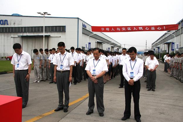 5月19日14時(shí)28分,華峰集團(tuán)在莘塍廠區(qū)舉行了為四川汶川大地震中遇難同胞默哀儀式。來自氨綸公司及其他子公司的100余名員工代表參加了活動(dòng)。集團(tuán)黨委書記致哀悼詞,隨后全體人員面對(duì)半降的國(guó)旗,默哀三分鐘,沉痛悼念在汶川地震中遇難的同胞。