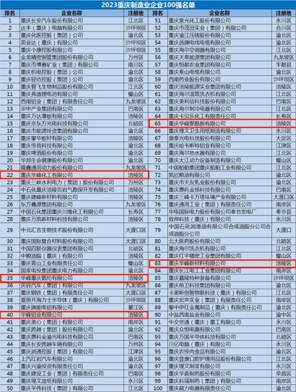 近日,由重慶市企業(yè)聯(lián)合會(企業(yè)家協(xié)會)主辦的2023重慶企業(yè)100強和2023重慶制造業(yè)企業(yè)100強榜單重磅發(fā)布。重慶華峰化工、華峰重慶氨綸、華峰鋁業(yè)三家公司分別位列2023重慶企業(yè)100強的第44、72和82位,其中,華峰鋁業(yè)為首次入圍市級百強企業(yè)榜單。此外,三家公司還分別位列重慶制造業(yè)企業(yè)100強榜單的第22、35和40位,重慶聚酰胺和重慶新材料則分列65位和83位。