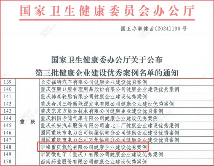 日前,國(guó)家衛(wèi)生健康委辦公廳公布第三批健康企業(yè)建設(shè)優(yōu)秀案例名單,華峰重慶氨綸有限公司成功入選,是重慶市本次獲評(píng)12家企業(yè)之一,也是涪陵區(qū)歷年以來唯一上榜的企業(yè)。